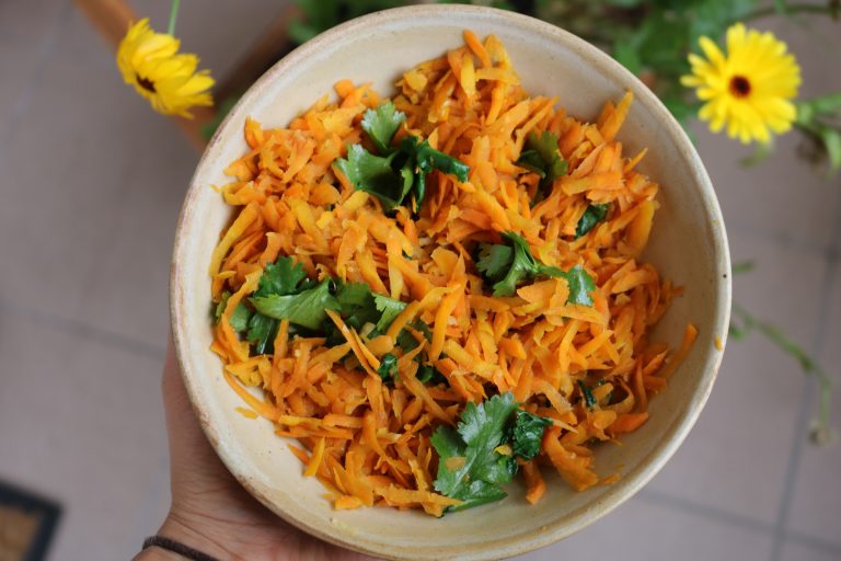 Czego potrzebuję? 2 ząbki czosnku 3 marchewki 1 łyżka oliwy z oliwek 2 łyżki sosu sojowego (jeśli potrzebujesz- daj więcej) Pieprz Garść