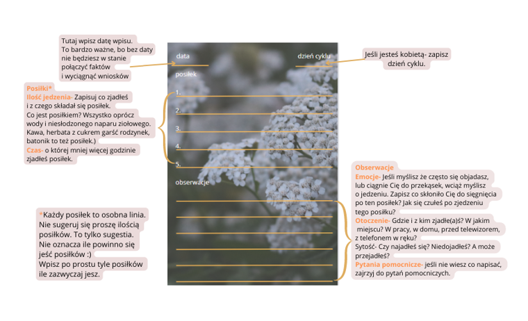 Dzienniczek najlepiej jest wypełniać codziennie przez przynajmniej tydzień lub do zauważenia pierwszych efektów. Wiem, że w codzienności jesteśmy zabiegani i czasami ostatnie o czym myślimy to o dodatkowych obowiązkach. Dlatego ułatwiłam to najbardziej jak można. Poniżej znajdziesz edytowalny pdf i instrukcję jego wypełniania. Możesz edytować go na swoim telefonie, albo wydrukować i zabierać ze sobą. Pamiętaj, że możesz też wypełniać go po swojemu i nie sugerować się moimi podpowiedziami. Zrób tak żeby było to dla Ciebie czytelne. Jeśli chcesz coś dopisać- dopisz. Jeśli nie czujesz potrzeby o czymś pisać to nie pisz